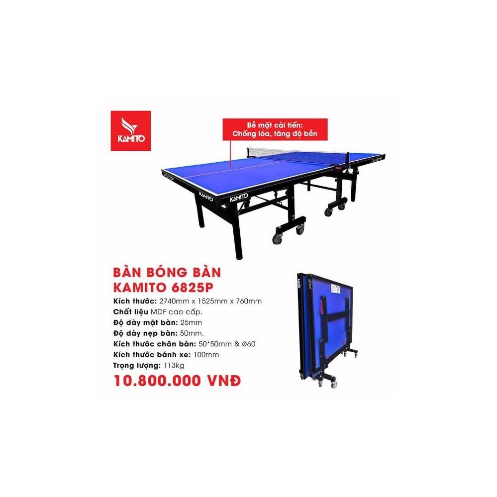 - Bàn Kamito 6825P thế hệ mới được làm từ gỗ MDF cao cấp có độ bền cao. Mặt bàn của bàn 6825P được phủ lớp sơn chống lóa và tinh chỉnh, nâng cấp giúp độ nảy của bóng luôn rất đều và ổn định. Bộ chân đế được làm từ thép cao cấp chịu lực với kích thước 50x50mm và đường kính chân trụ 60mm, mang tới sự vững chắc và cân bằng cho bàn. Gấp đôi dễ dàng hơn, dễ dàng di chuyển nhờ hệ thống xe cực tốt. Bánh xe có kích thước 100mm rất chắc chắn, Kích thước bàn 2740mm x 1525mm x 760mm