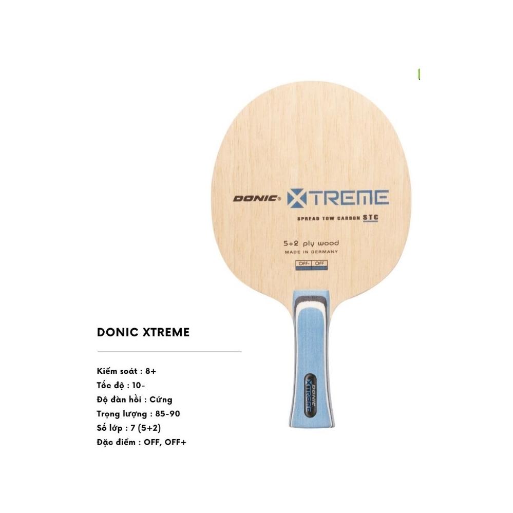Xtreme được Donic chấm thông số kiểm soát 8+ và tốc độ 10-, nếu so sánh một số mẫu vợt đang thịnh hành của Donic như JO-WALDNER GOLD EDITION ( 8+, 9+) , PERSSON OFF 89 ( 7, 10+) , ORIGINAL CARBOSPEED ( 6, 10++)