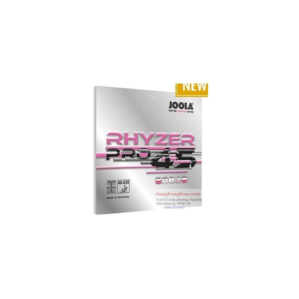 Joola Rhyzer Pro 45 lót màu tím. Không cứng như Joola Rhyzer Pro 50. Rhyzer Pro 45 vẫn dùng công nghệ Rhyzer Pro có tốc độ và độ xoáy đáng kinh ngạc, nhưng với miếng lót chỉ có độ cứng 45 ° .