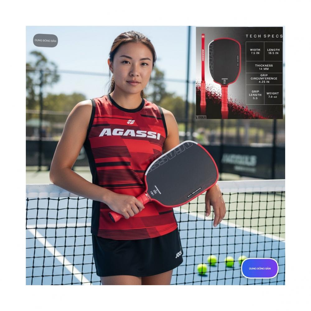 PickleBall Agassi Pro có thiết kế hiện đại, phối màu tinh tế và cán vợt được bọc grip cao su mềm, thấm hút mồ hôi rất tốt. Trọng lượng trung bình chỉ khoảng 7.8 – 8.1 oz, vừa đủ để kiểm soát bóng nhưng vẫn tạo được lực đánh mạnh khi cần. Sự cân bằng giữa đầu vợt và cán vợt mang lại cảm giác thoải mái khi chơi lâu dài.