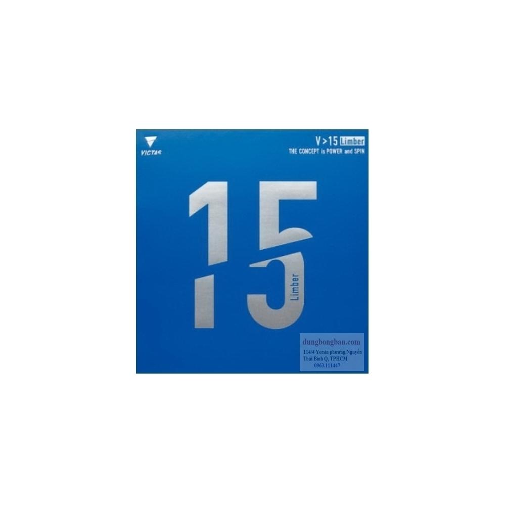 Victas V15 limber là dòng sản phẩm cao cấp của hãng Victas. Rất nhiều người tại Nhật dùng mặt vợt Victas V15 này thay thế cho mặt vợt Tenergy, Victas V15 limber có được viết là Victas V>15 Limber, mặt vợt này được đánh giá cao và sử dụng phổ biến với những đặc điểm như. So với mặt vợt Victas V15 Extra thì mặt vợt Victas V15 limber sẽ nhẹ hơn và chậm hơn, xoáy hơn. Thường mọi người dùng Victas V15 limber bên trái còn Victas V15 Extra bên phải.